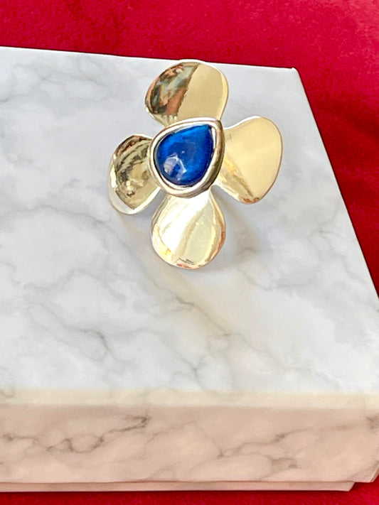 Vintage Yves Saint Laurent Flower Ring – Silver Tone with Deep Sea Blue Acrylic Stone (Adjustable)