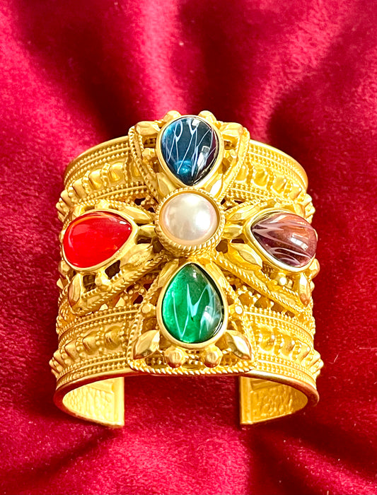 Statement Haute Couture Gold Plated Metal Cuff Colored Glass Vintage Design 90’s Style Yves Saint Laurent Christian La Croix