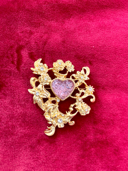 Flower Engraved Metal Heart Brooch Pink Resin Heart Color