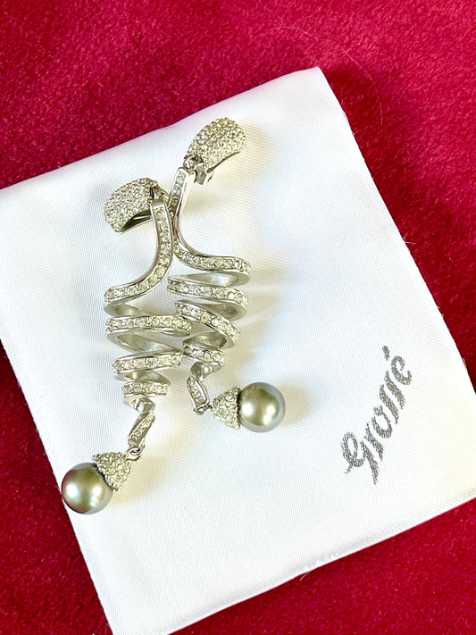 Grossé Pearl Drop Pendant Earrings Silver Metal, Rhinestones & Grey Pearls