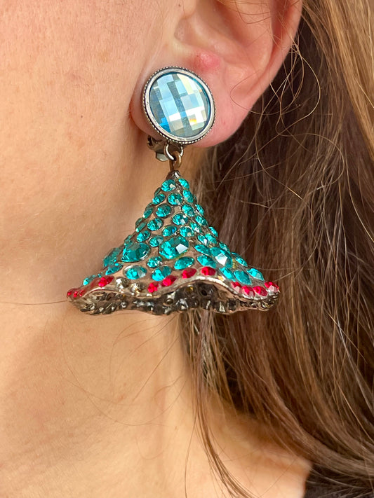 Yves Saint Laurent Rive Gauche Vintage Statement Earrings ,Turquoise & Red Rhinestones Signed, Rare