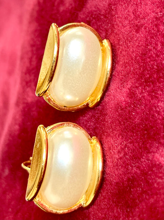 Yves Saint Laurent Vintage YSL Gold Tone Faux Pearl Clip On Earrings Gold Plated 18KG