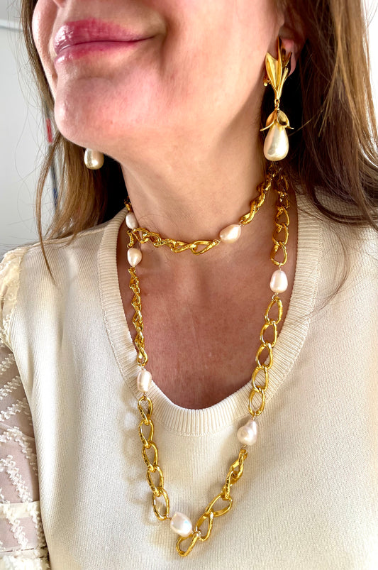 Elegant Gold Plated Jewelry Set Freshwater Pearl Necklace & Drop Earrings Haute Couture Style