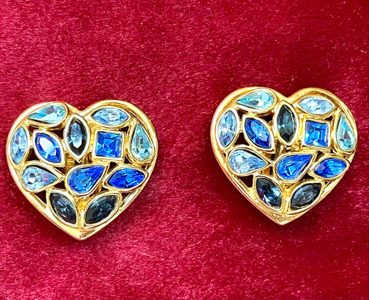 Vintage Yves Saint Laurent Blue Heart Crystal Earrings – Gold Tone