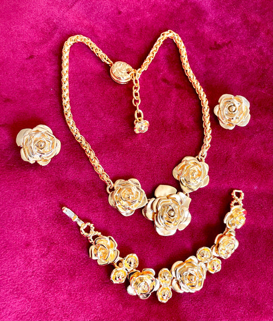 Rare Flower Vintage Yves Saint Laurent Gold Plated Jewelry Set – Necklace, Bracelet & Earrings – Signed YSL, Made in France