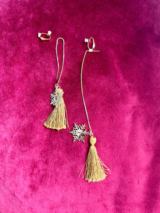 Yves Saint Laurent Signed Snowflake Charm Tassel Earrings – Gold Tone, Upcycled