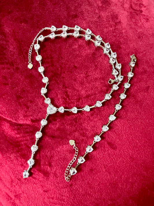 Long Silver Rhinestones Heart Necklace Bracelet Set