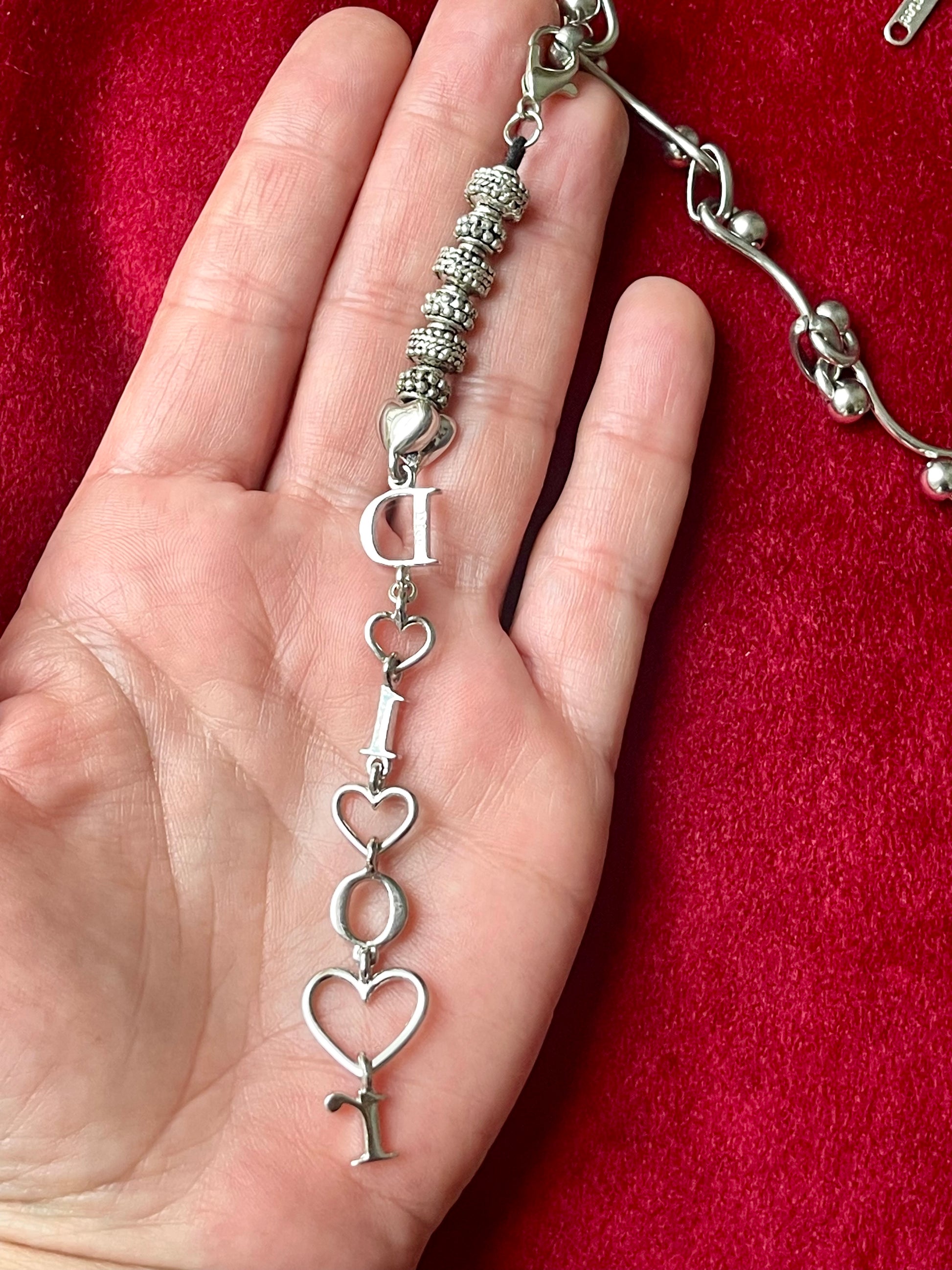 ¡Convierte un icónico charm de Dior en una pieza llamativa! Este colgante único en un collar plateado se puede llevar a tu gusto: ajústalo a la cadena, combínalo con otras piezas o úsalo como un elegante charm para tu bolso. Fácilmente reversible a su diseño original, esta pieza única añade estilo, versatilidad y personalidad a cualquier look. Mira las fotos: cada detalle forma parte de su encanto.