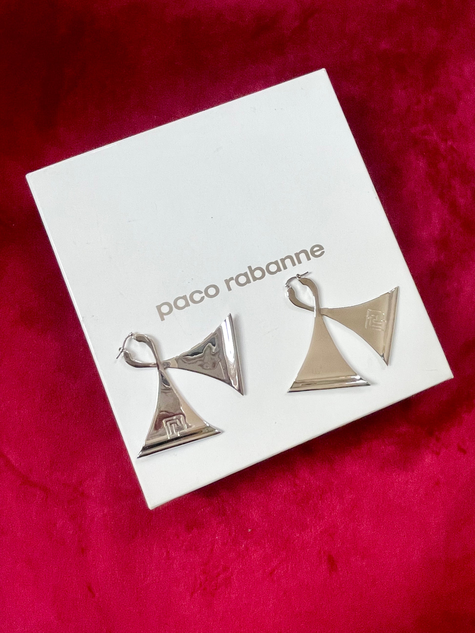 Excepcionales pendientes vintage de Paco Rabanne en tono plateado, con formas geométricas esculturales inspiradas en el icónico lenguaje arquitectónico y futurista de la marca. Una pieza de diseño difícil de encontrar con un gran atractivo para coleccionistas.