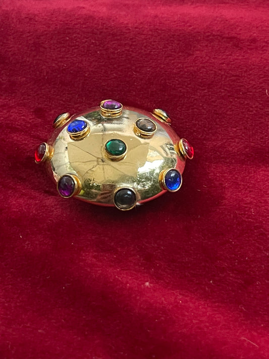 Broche vintage Yves Saint Laurent Sunburst – Années 1980, ton or avec cabochon vert, pièce de collection rare