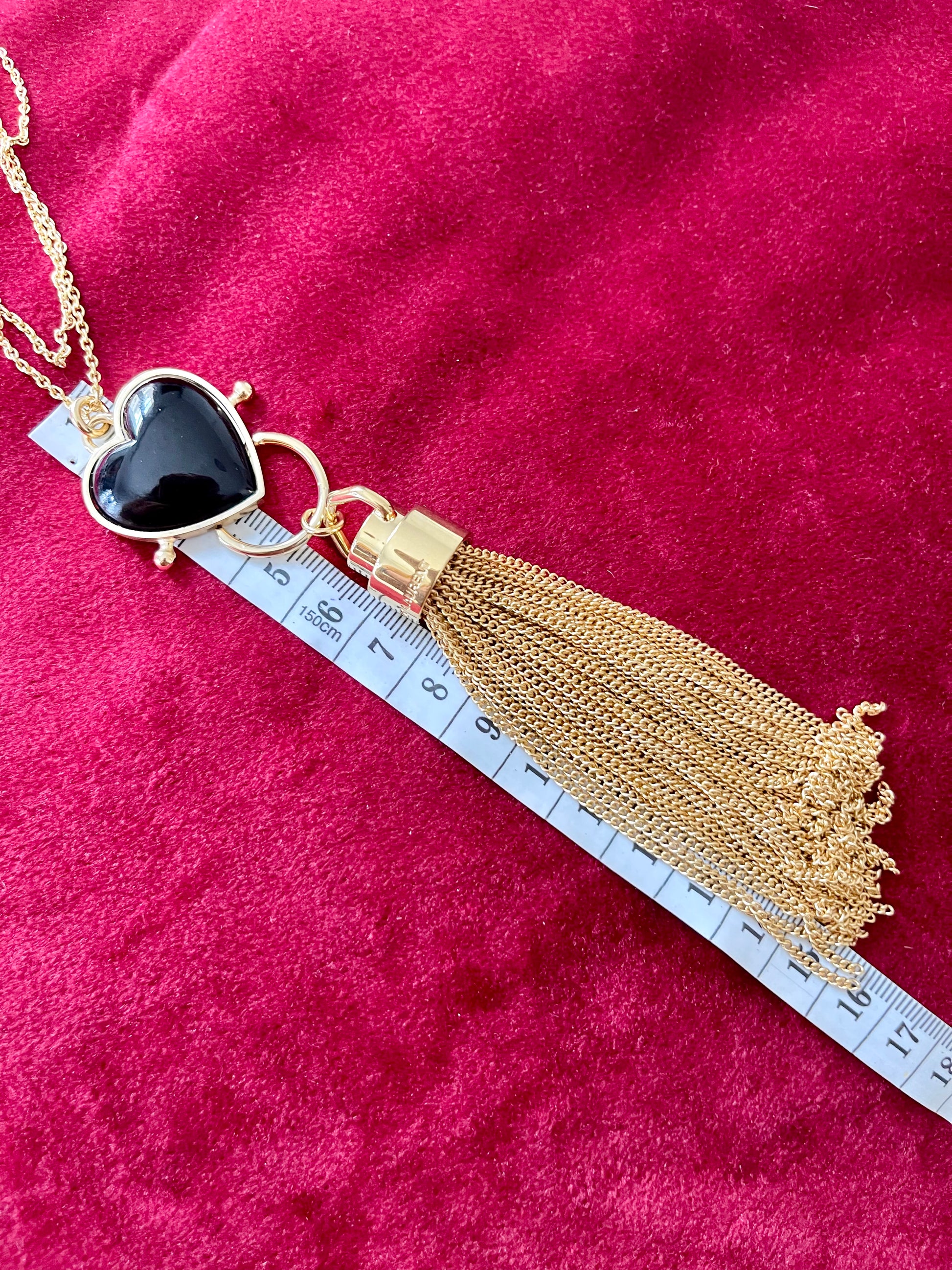Mutton Collet Black Resin Heart Necklace with Attached Saint Laurent Tassel Charm