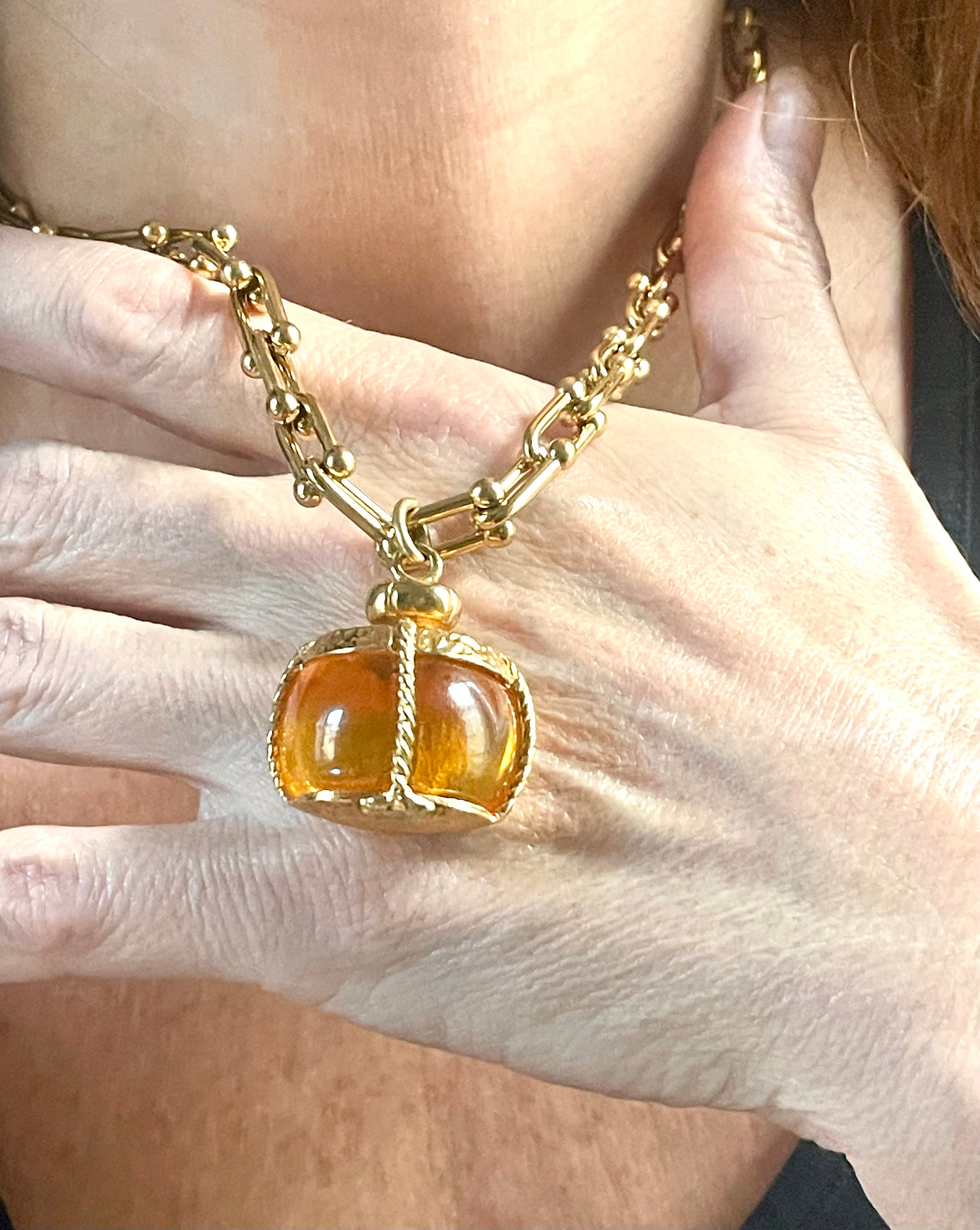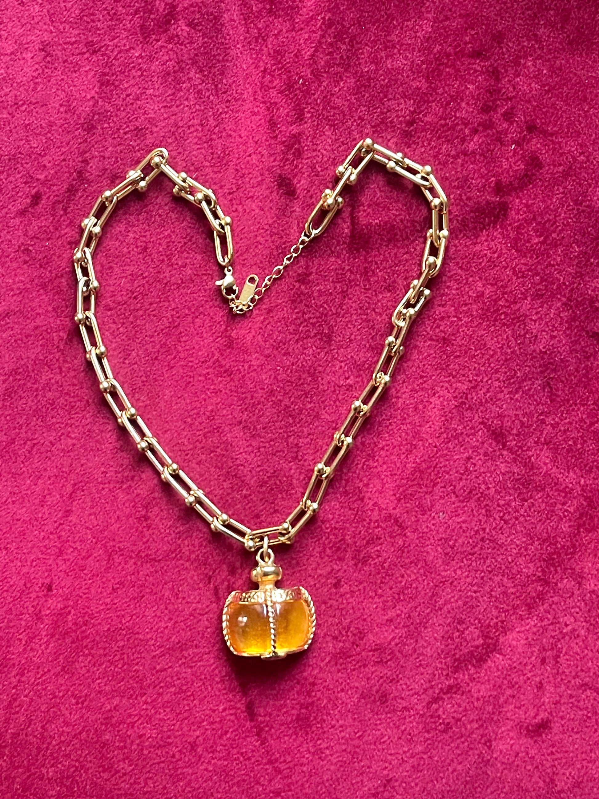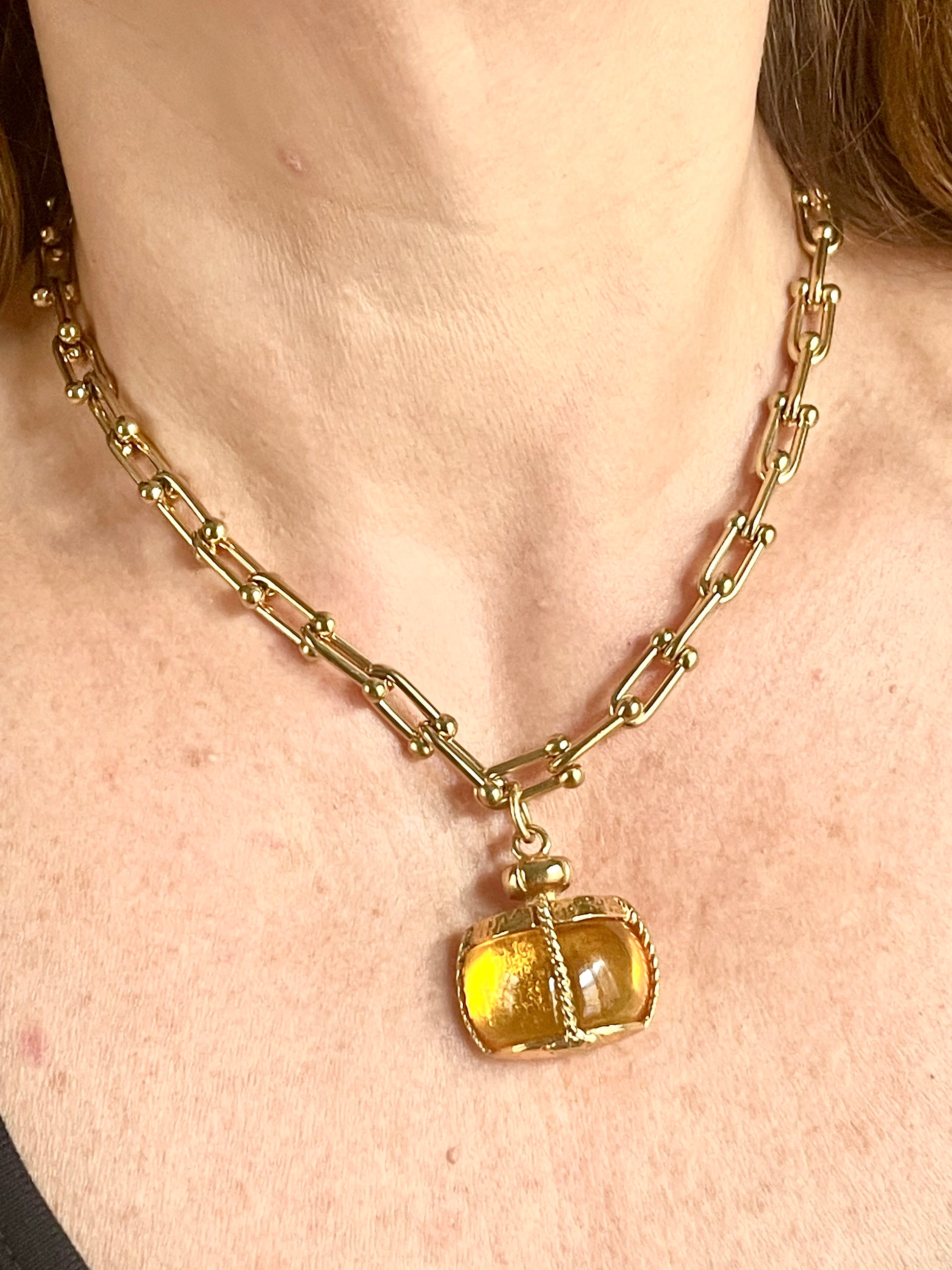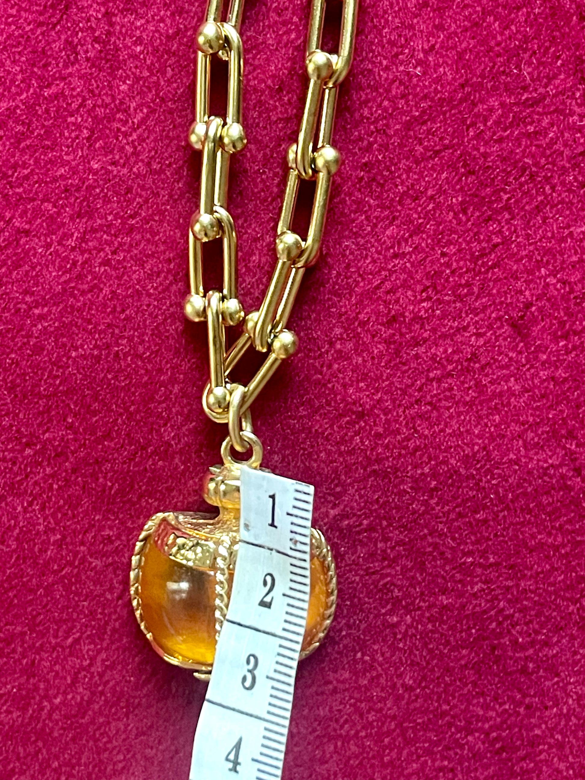 Vintage pendant from Yves Saint Laurent in a very good condition associated with a beautiful stainless steel gold link necklace of adjustable size. The pendant can be worn on both sides and different lengths . The honey brown resin changes color depending on the light exposure. Please check out the photos provided.