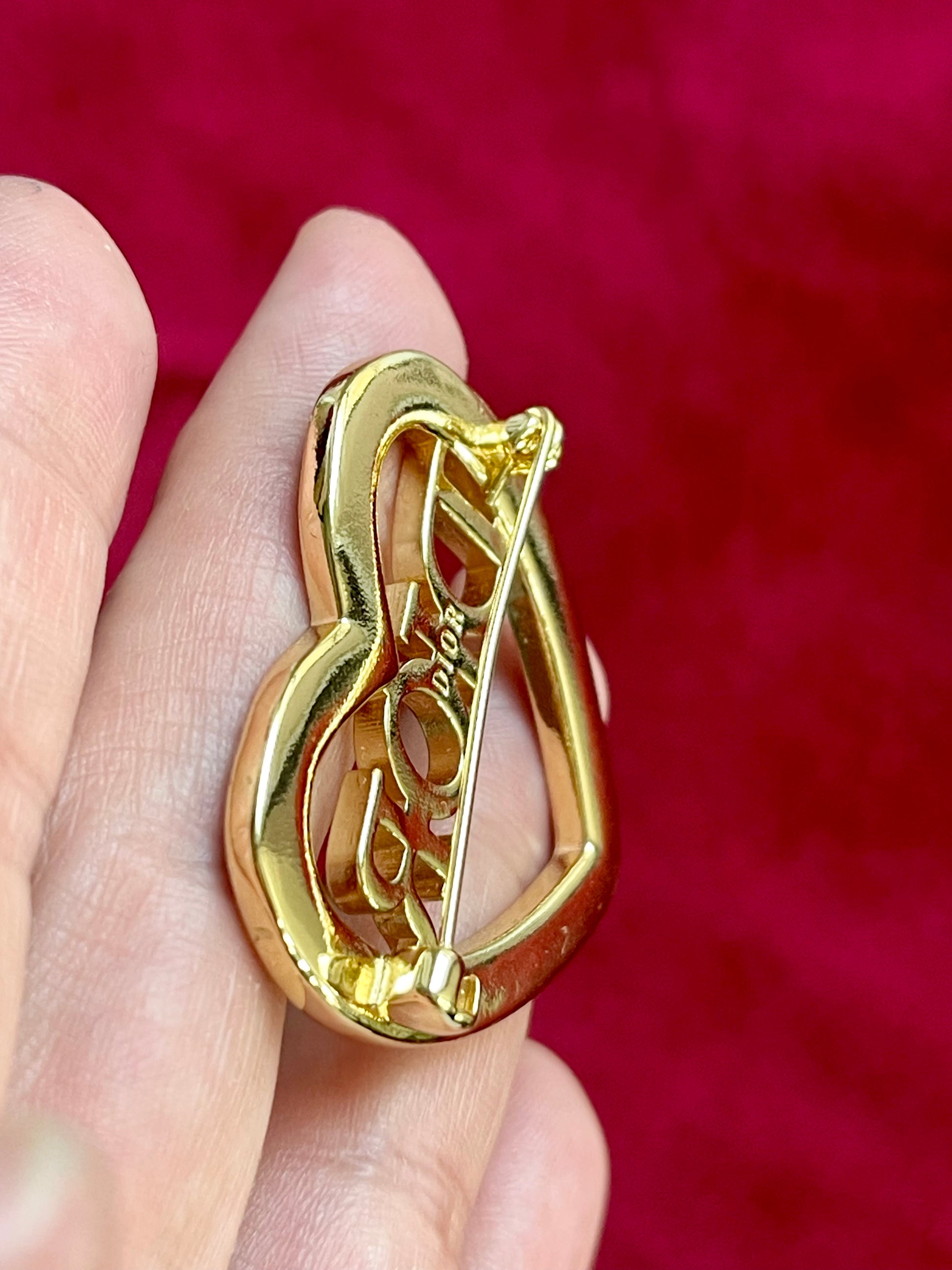 Beautiful vintage Christian Dior brooch featuring a black enameled open heart design with a gold tone Dior logo at the center. A charming and collectible accessory that adds timeless elegance to any outfit.