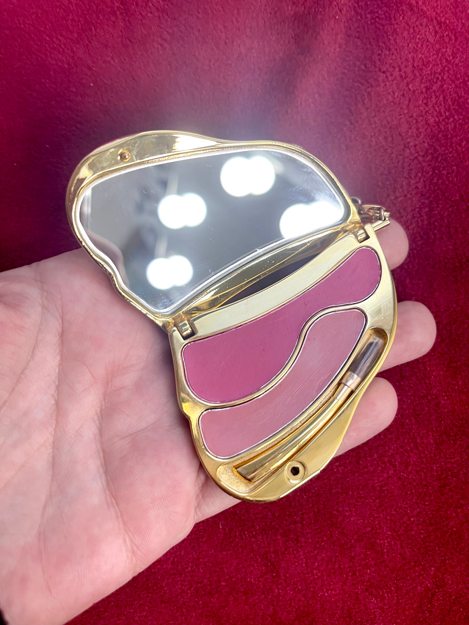 This vintage, preloved My Dior bag charm features a unique saddle-like design with a mirror and a compartment that originally held lip gloss (two available-one with gloss, one empty). A truly rare and collectible piece, these charms are hard to find and make a perfect addition to any Dior or designer accessory collection. Once the gloss is emptied, the compartment can be repurposed as an emergency medicine holder or refilled with lipstick. Please check the photos and video provided for a closer look. As with all vintage items, signs of wear are to be expected, but multiple photos have been included to clearly show the charm's condition.