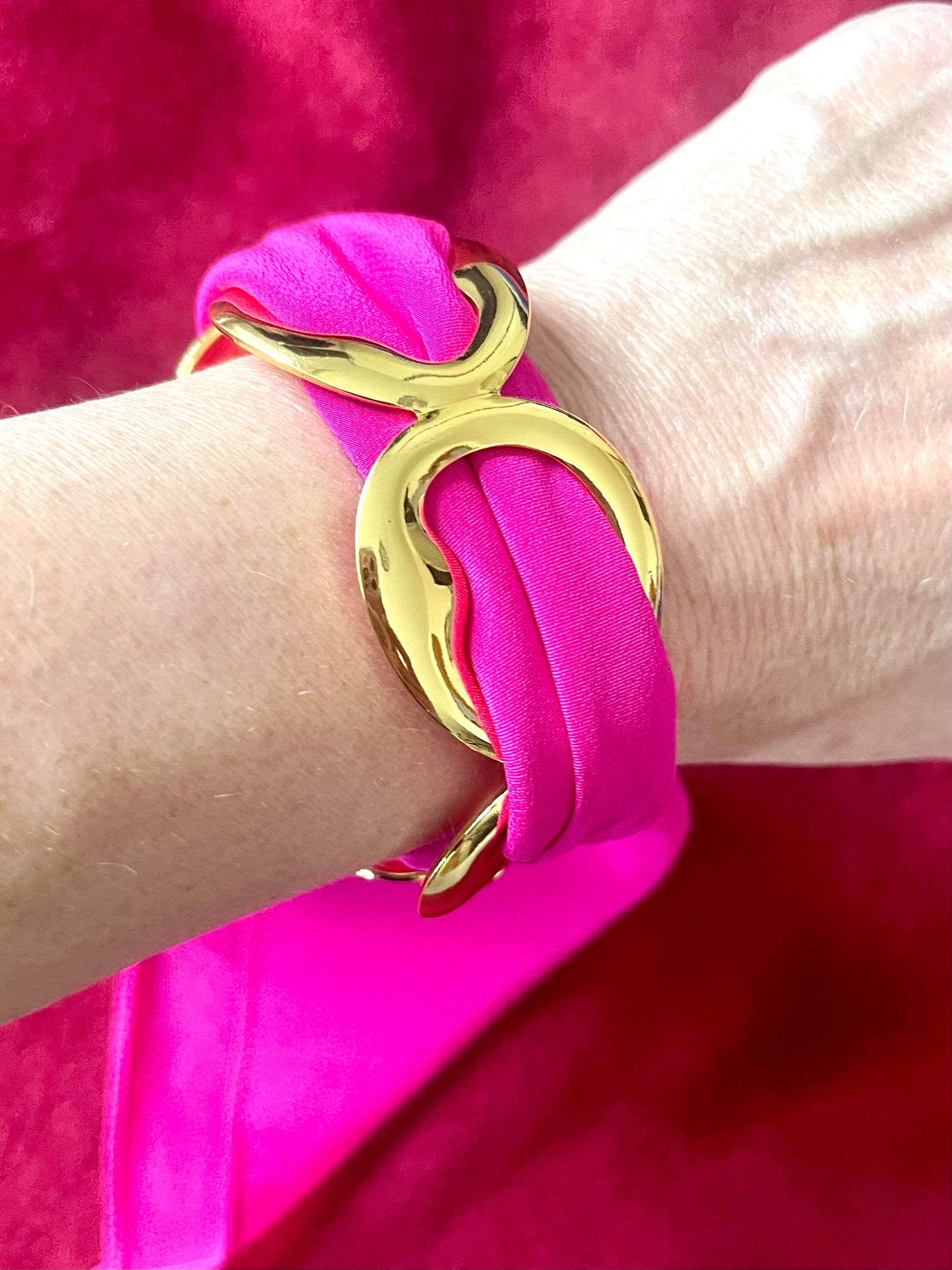 A chic customized set combining a vintage Dior pink silk scarf in very good condition with a brand new gold-plated stainless steel bracelet. Both pieces can be worn together or separately for versatile styling.