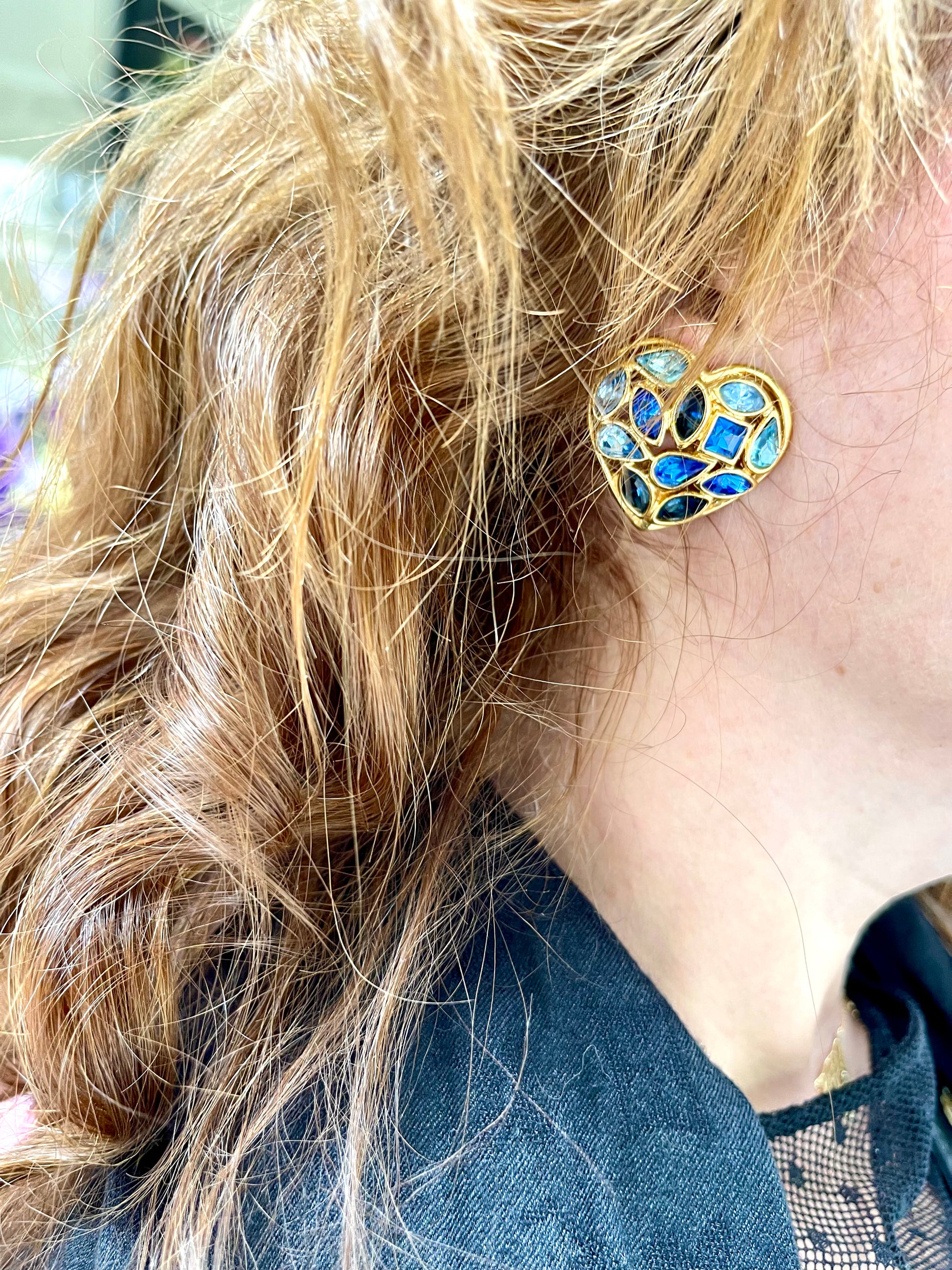 Stunning vintage Yves Saint Laurent earrings of timeless elegance . Crafted in a radiant gold tone metal, each earring features a heart shaped design beautifully adorned with an array of multi shaped and blue crystals. Soft hues of blue variety stones create a mosaic effect that is both romantic and luxurious.