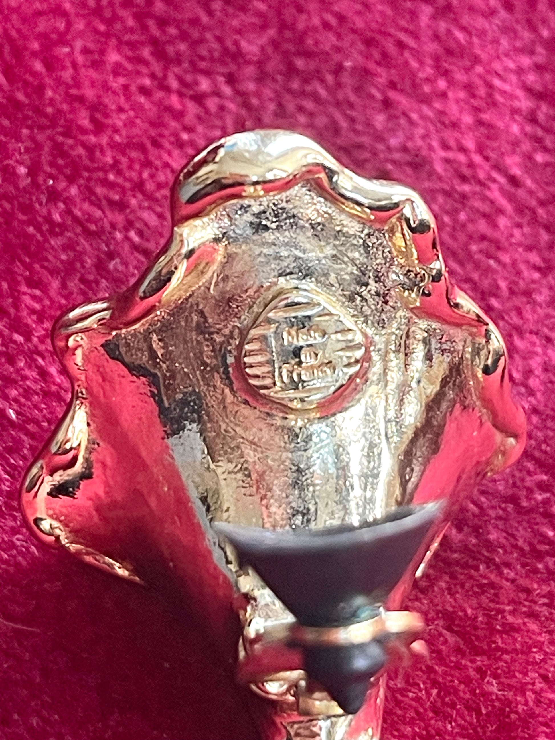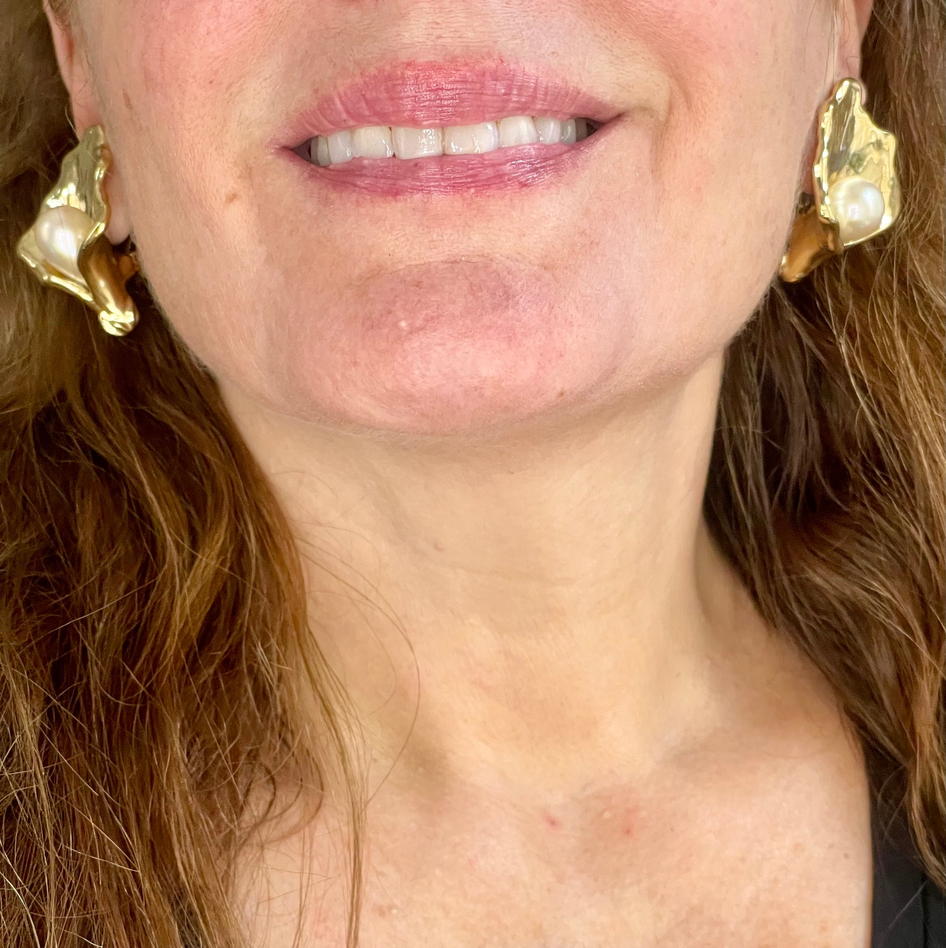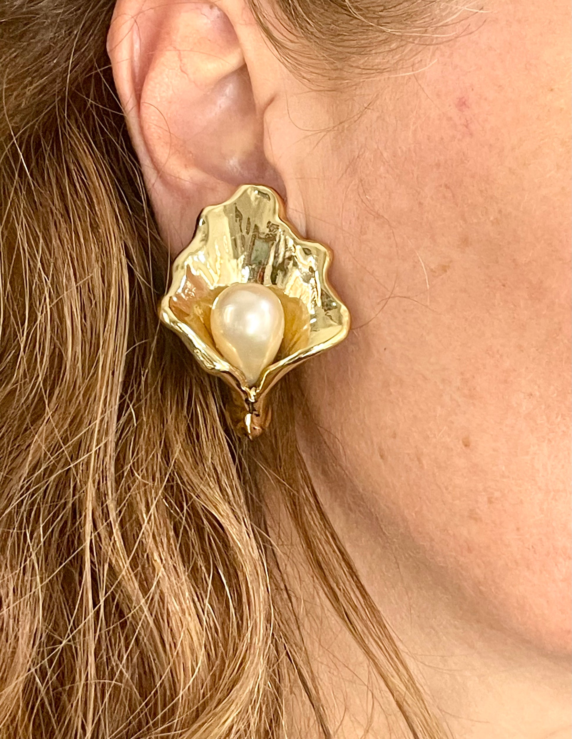 Sculptural vintage Yves Saint Laurent statement earrings featuring a bold calla lily floral design in a rich gold-tone finish. Each earring is centered with a luminous pearl, highlighting YSL’s iconic organic and elegant aesthetic.