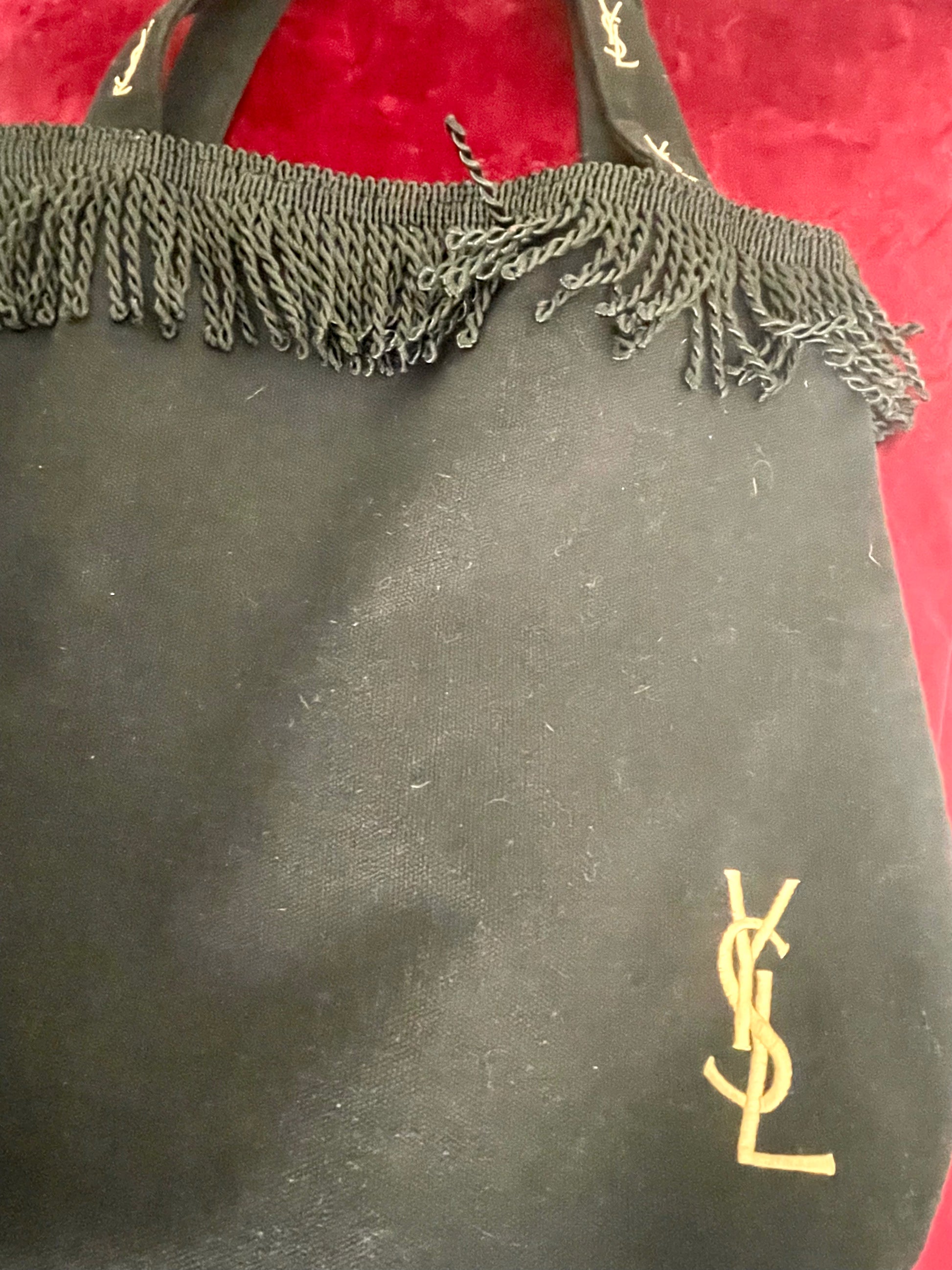 Customized vintage tote that is in perfect condition since it was never used . A cotton black canvas tote and golden YSL embroidery . The tote is wide and spacious, very practical for every day chores , school , uni books etc . I added a silk cotton black fringe around the top just for extra uniqueness.