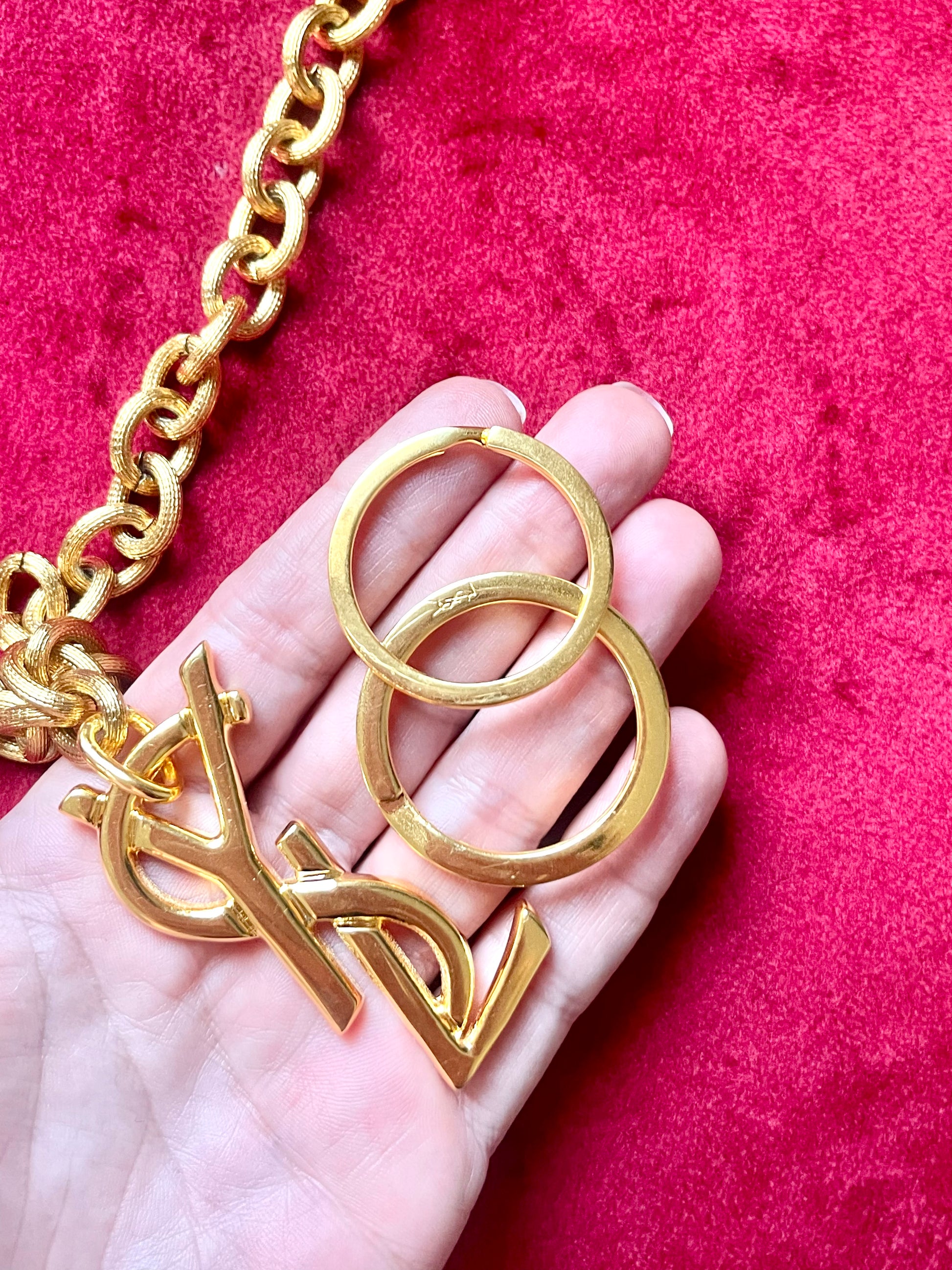Statement oversized YSL pendant originally sourced from a vintage authentic Yves Saint Laurent bag charm and carefully upcycled into a versatile long chain necklace or belt.