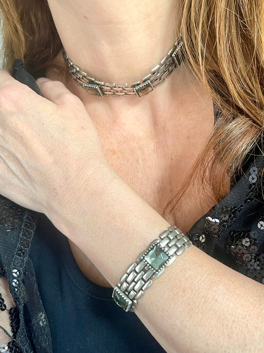 Vintage 1980s Paco Rabanne Silver Tone Rhinestone Bracelet & Necklace Set — Statement Designer Jewelry